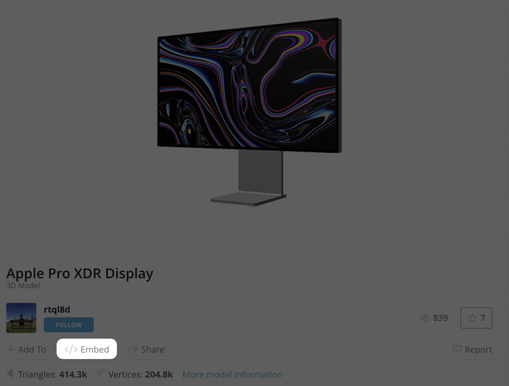 In the uploaded 3D model, you will find the embed code, such as the image shown below: